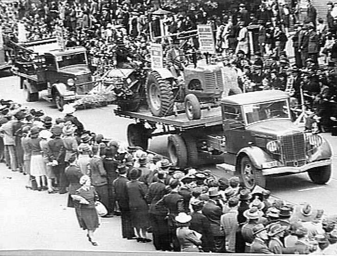 Black and white photograph of H.V McKay Massey Harris machinery in a parade organised to raise funds for the Fourth Liberty Loan campaign during the World War II.