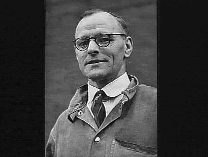 Black and white image of Jim Guest who worked on a milling machine in the H.V McKay Massey Harris Tool Shop. He was the first President of the company's Social and Welfare Association.
