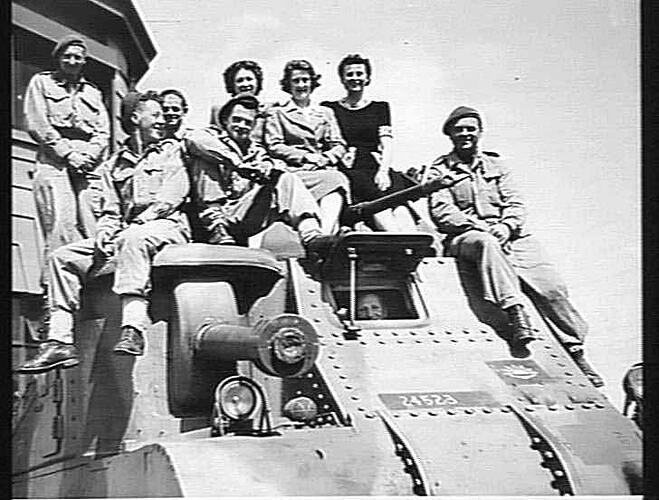 Seated on the 'General Grant' tank with servicemen are 3 employees: from left to right: Miss Wright (Army) Miss Ross (Navy) Mrs Summers (Air Force). These women raised money from their fellow employees as loans for the war effort.