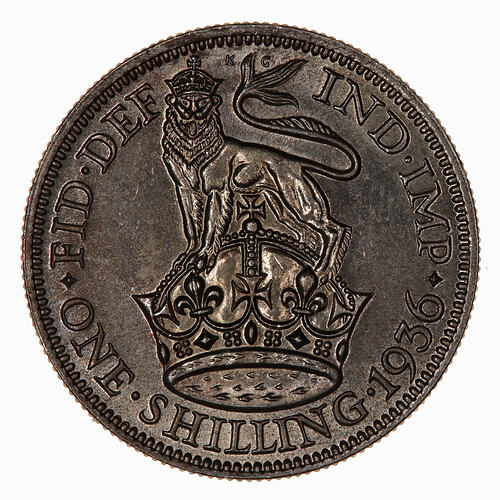 Crowned lion to left head facing, standing on crown, the date, 1936, divided by the crown; around above, FID: DEF: IND: IMP:; around below, ONE SHILLING