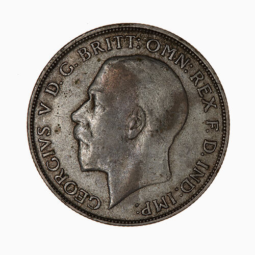 Bare head of the King facing left; below on neck truncation in small letters, B.M. (Bertram MacKennal); around, GEORGIVS V D.G. BRITT: OMN: REX F.D. IND: IMP: