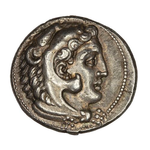A silver tetradrachm coin issued in the Empire of Alexander the Great in the period 336-323 BCE.