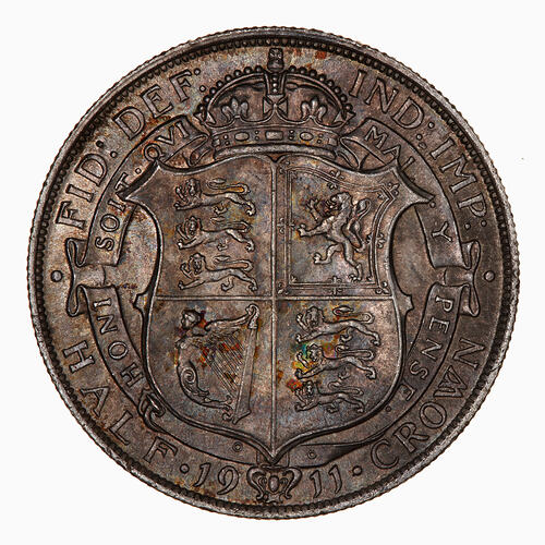 At centre within Garter inscribed HONI SOIT QVI MAL Y PENSE; a crowned shield quartered with the arms of England (1 & 4) Scotland (2) and Ireland (3); around above FID: DEF: IND: IMP:; around below, HALF 1911 CROWN the date being divided by the base of the Garter