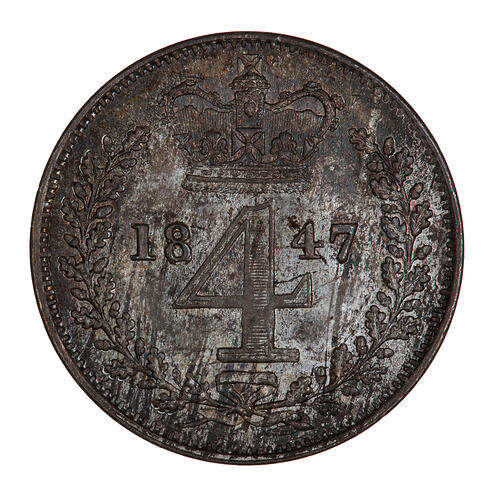 At centre within an open oak wreath; the numeral 4; above, crown; the numeral dividing the date 1847