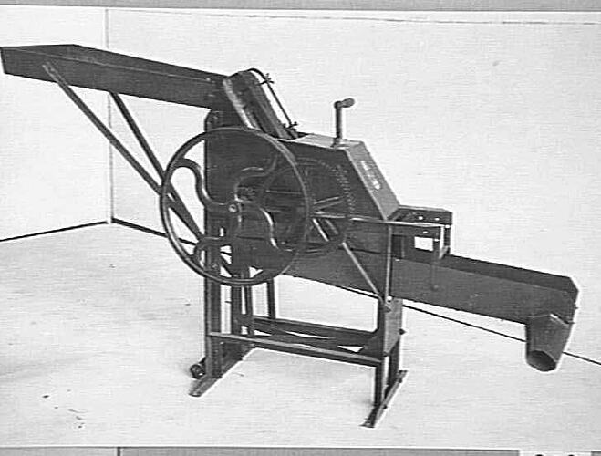 Hand-operated or power-driven No.6 Massey Harris maize sheller, manufactured in Toronto, Canada. The feed table is at the top of the picture and the grain delivery chute is in the lower right hand corner.