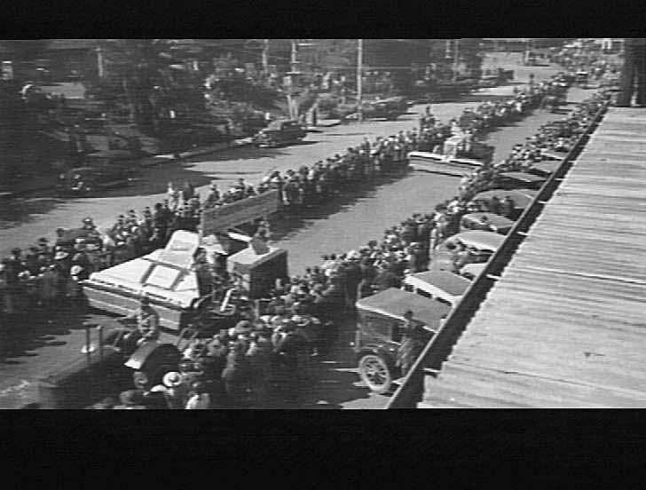 Agricultural Equipment, Motor Vehicles, Palm Trees, Parades, Public Events, Roads, Spectators, Streetscapes, Tractors, Workers