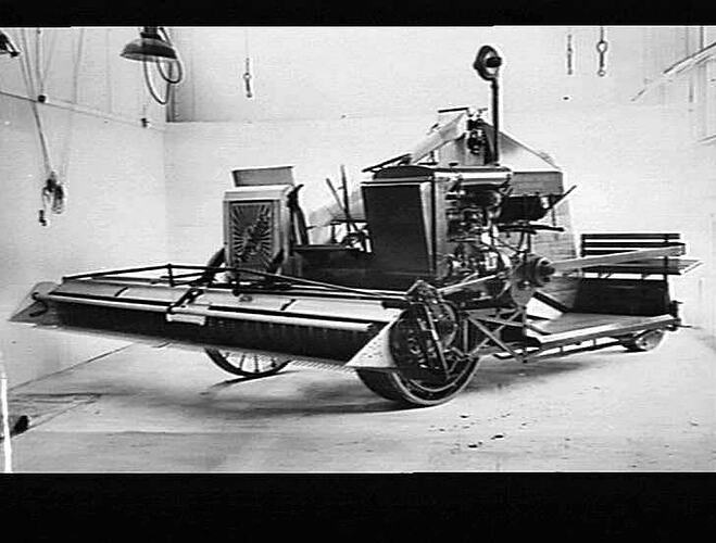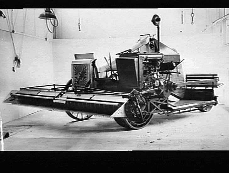 A '12 ft Auto header on steel wheels, powered by a'Wisconsin' engine, showing the reverse action of the spirals to take the crop into the front elevator. Note the McKay spark arrestor (V6024!) and the bagging-off platform.