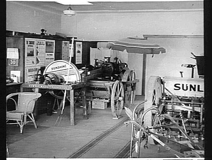 Photo showing the showroom interior of McKay agent, Louez Bros., with McKay Massey Harris machinery on display, including chaff cutter, sack trolley, 'Sunlea' combine drill, single furrow plough, pitchfork, etc.. (note the date on the calendar shows Novem.