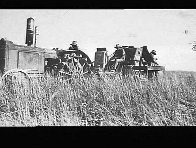 A 'Sunlight' header being drawn by a 'Ronaldson Tippett' tractor.