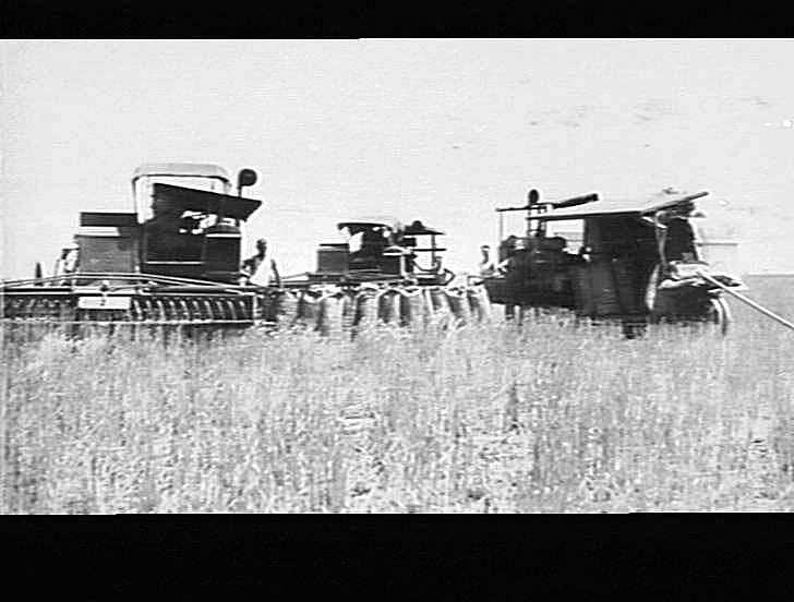 3 12ft Sunshine 'Fordson'-powered auto headers at work in 3,600 acres of wheat. Note the home-made sunshades.