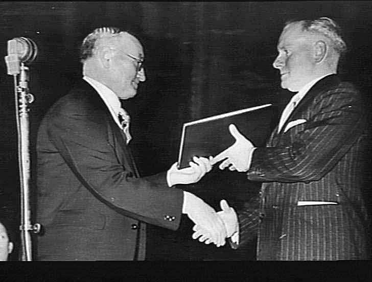 Black and white photograph taken at the Melbourne Town Hall, 21 August, 1944, at the Diamond Jubilee of the Sunshine Harvester. Mr Fred Bult (at left) is presenting the Book of Signatures to Mr Cecil McKay.