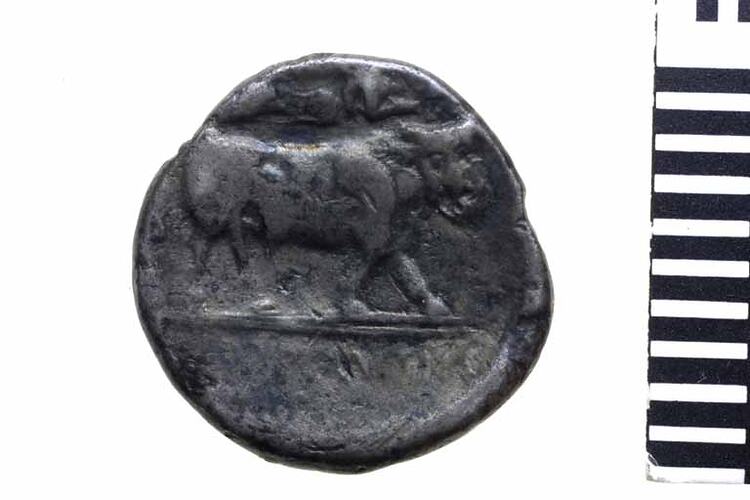 Man headed bull walking to right, head facing. Nike flying right above the bull is crowning it with a wreath. Below the bull in the exergue wear has removed most letters of the word NEOPOLITES