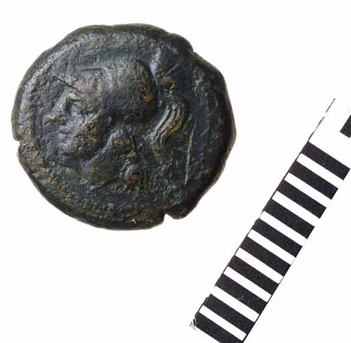Head of Pallas Athena facing left wearing a crested Corinthian helmet.