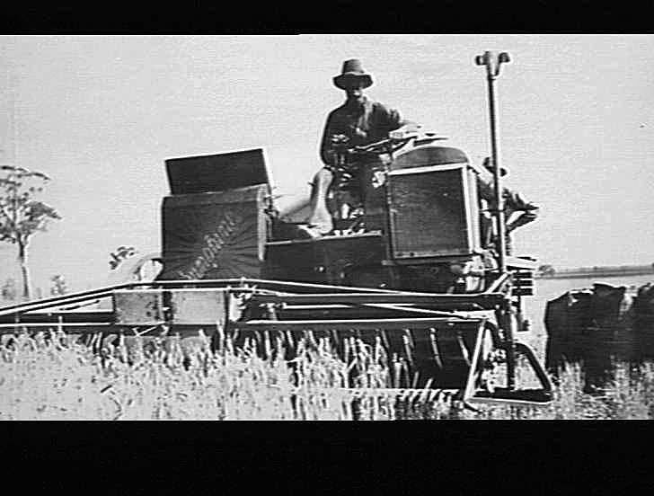 Mr T.J. Page driving his 'W' type Sunshine 'Fordson'-powered auto header at Parkes, N.S.W..