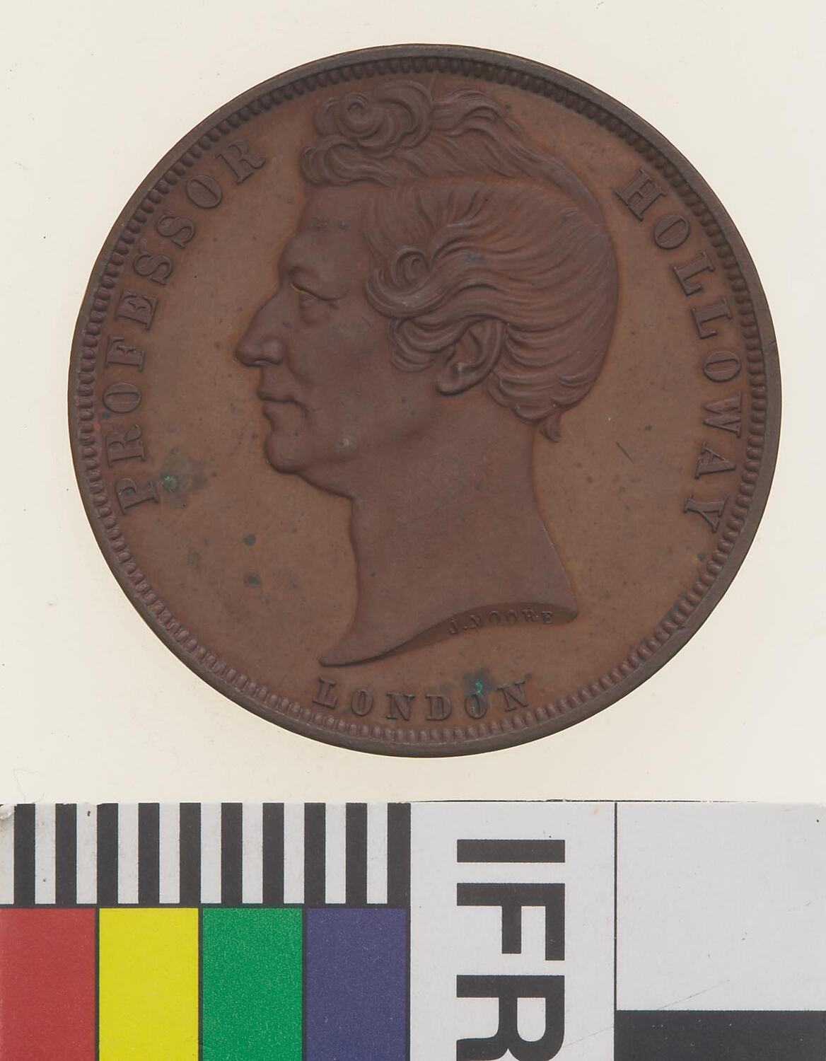 Head of Professor Holloway facing left with J. MOORE (the maker's name) in relief on neck truncation; around, PROFESSOR HOLLOWAY; below, LONDON.