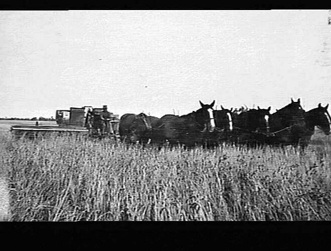 Rown by Messr 's R & A J Peter's Hilston N.S.W. November 1934 10 ft'Sunlight' ground drive header drawn by a 8 horse tandem team.
