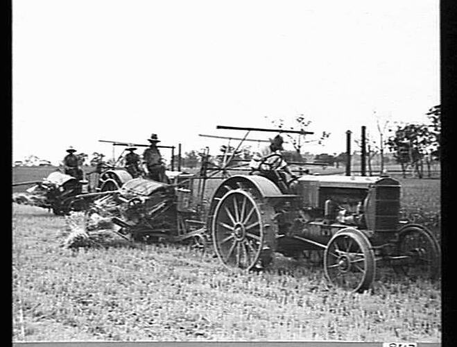 2 Massey Harris 'Wallis' tractors hauling 6 b ground-drive binders on e. R. Paech's farm, Walla Walla, N.S.W.. Both tractors are fitted with cast steel'McGregor grips' (known as walking grips due to the way they.