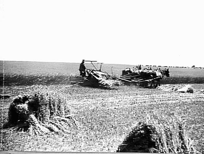 A 4-horse-drawn 6B binder at work in a good crop of oats. Stooks of sheaves can be seen in the foreground. [Note: This is probably the Sunshine Massey Harris Reaper-Binder, released in c.1934, which preceded the Model 6B Sunshine Massey Harris Reaper-Binder]