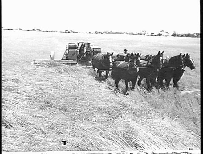 A 8-horse team in tandem pulling a 10 H.S.T. header in a wind affected crop. Under these conditions, much more straw has to be taken with the grain.