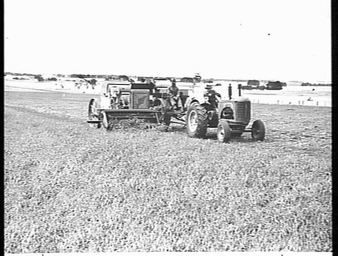 'Mr Ubergang, Tarrington, Vic, with Sunshine No.2 header equipped with pick-up front and cutter bar, operating by power-take-off from Sunshine Massey-Harris 203 senior, harvesting green feast peas, an 8 to 9 bag crop, at five miles per hour: Jan 1945.'.