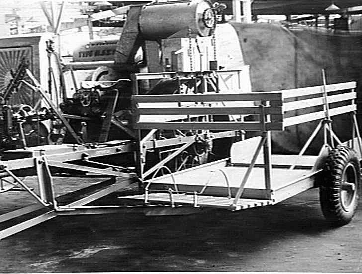 This photo taken in the factory is a front view of a No.2 header showing the bagging-off platform fitted with pneumatic wheel. The angle-iron supports which forms the pull to the bagging-off platform can be clearly seen.