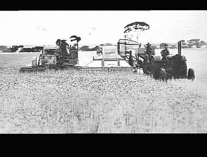 A Massey-Harris Model 25 tractor pulling a 10 ft 'A.L.' harvester followed by a'Fordson' powered 12 ft auto header harvesting wheat.