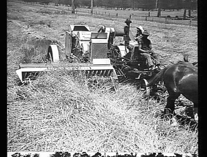 Horse-drawn 10 ft Engine functioned H.S.T. header, fitted with crop lifter fingers, working in a down and tangled crop of wheat.