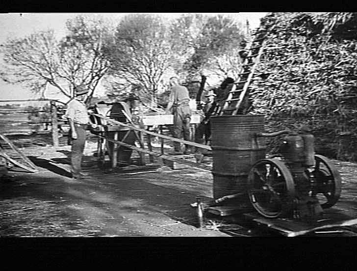 5 h.p. 2-stroke Sunshine engine driving a No.4 AX chaff cutter. Hay from the stack is fed into the chaffcutter, cut and bagged ready for transport.
