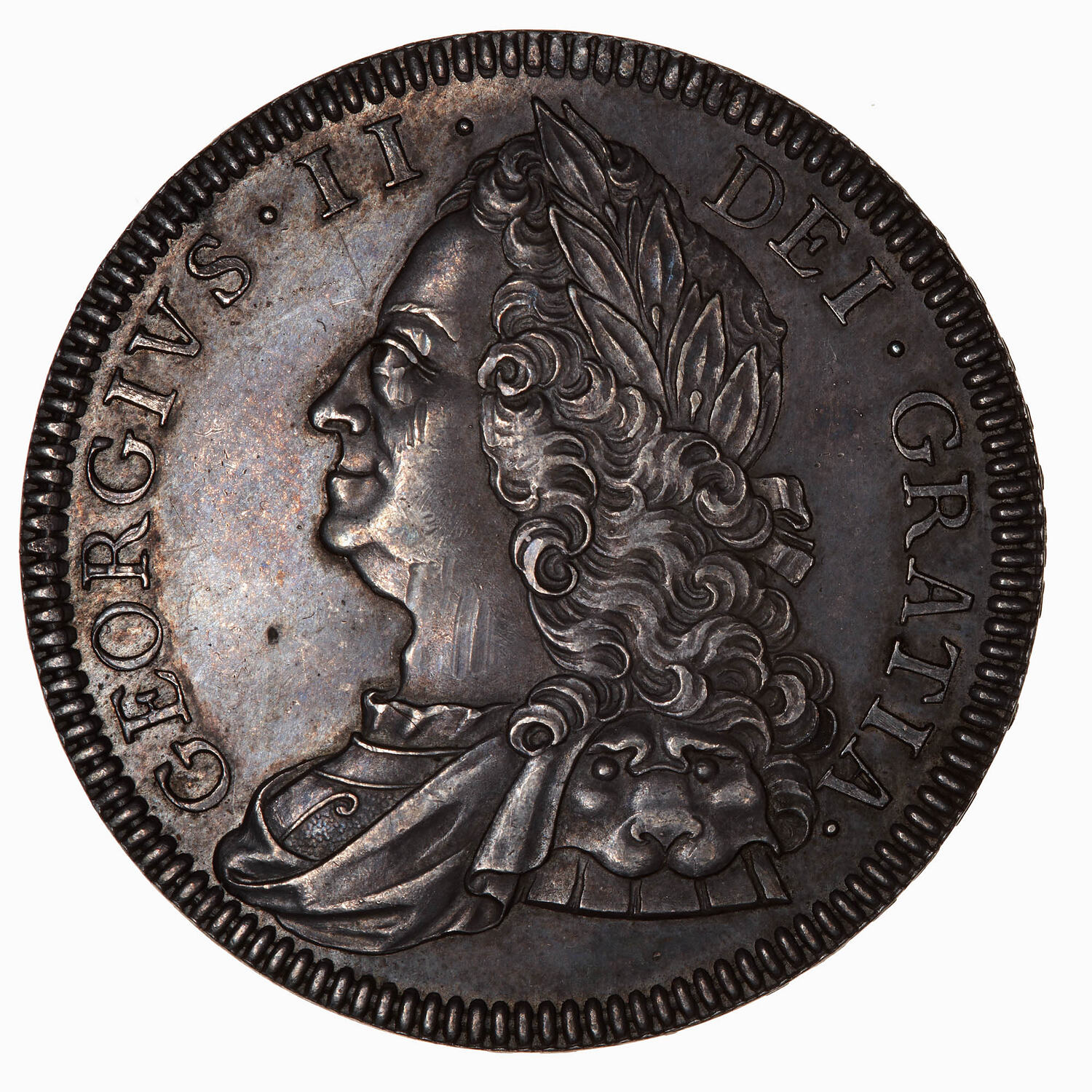 Lauriate and draped bust of the Kinf facing left wearing armour, lion head on shoulder; around, GEORGIVS II DEI GRATIA