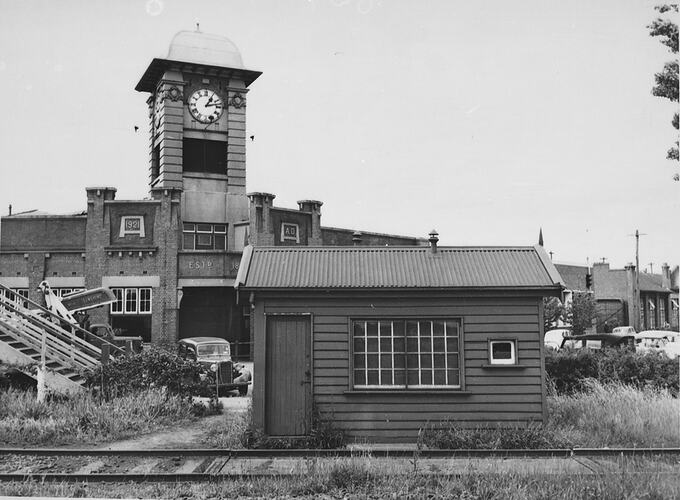 Photo shows the railway weighbridge office adjacent to the (original) clock tower and Showroom at the end of Devonshire Road, Sunshine. Also shown are the steps of the overhead footbridge over the Melbourne to Bendigo train line.