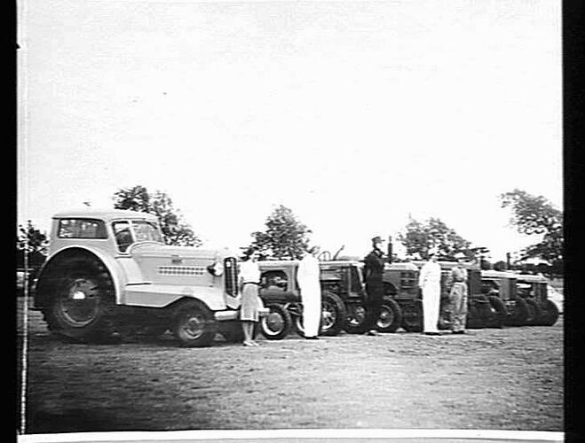 Photo shows various types and makes of tractors on display or perhaps a 'hand over' to the military or land-army.