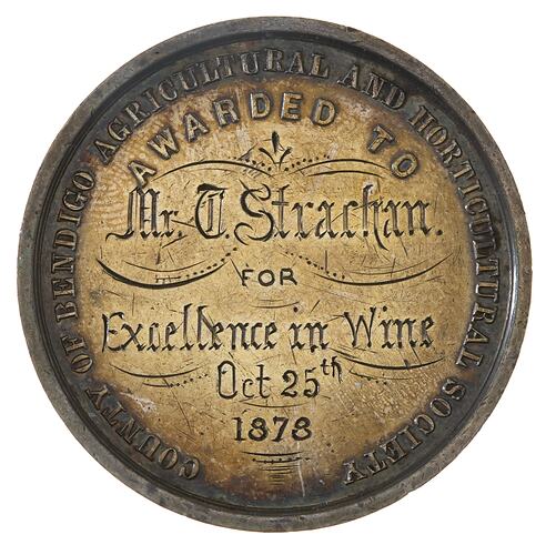 Around rim, COUNTY OF BENDIGO AGRICULTURAL AND HORTICULTUAL SOCIETY at centre, AWARDED TO / Mr. T. Strachan / for / Excellence in Wine / Oct 25th / 1878