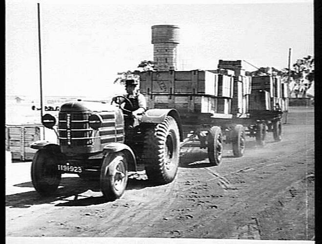 Massey Harris Model '101''Super' tractor, fitted with extra guards and engine cover, used by 'Gamblings Ltd.', heavy haulage contractors, towing two loaded 4-wheel trailers. Note the covers on the headlamps known as' black-out' lights used during the World War II.