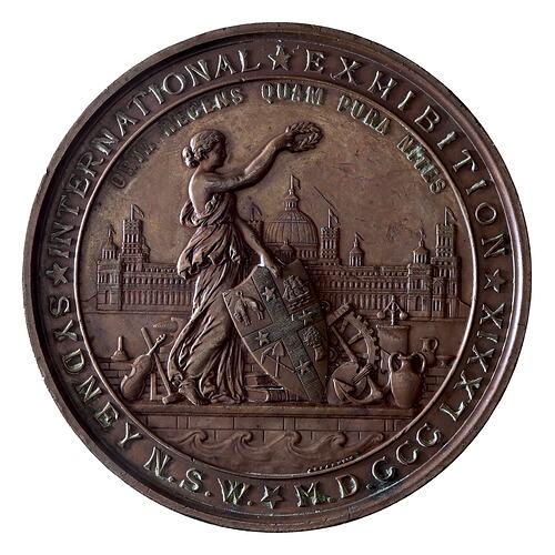 A large bronze prize medal (76 mm) featuring a view of the Sydney Garden Palace Exhibition Building with a figure of New South Wales standing in front holding the colonial shield and surrounded by exhibition goods.