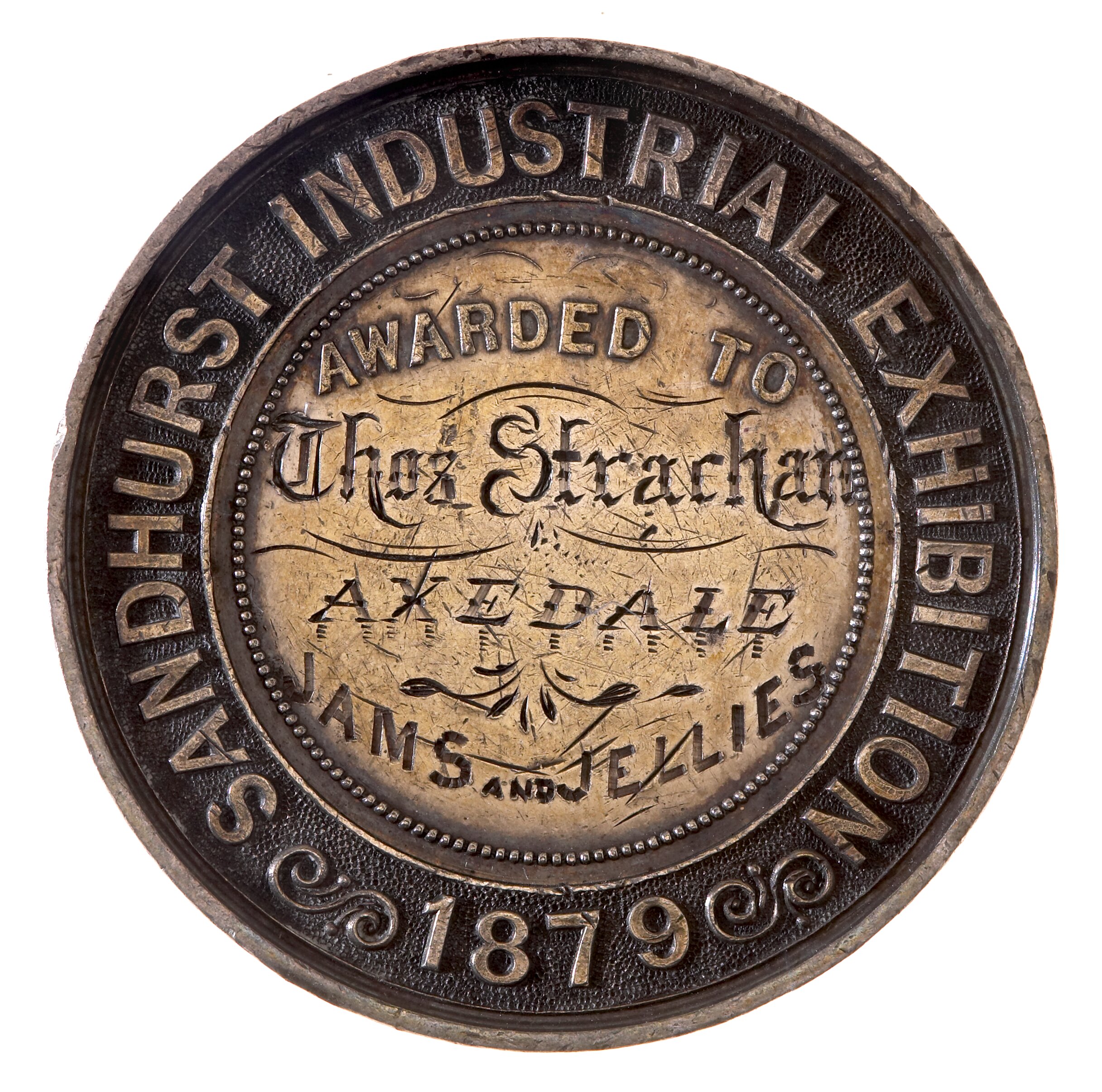 Engraved; Thos Strachan / AXEDALE / JAMS AND JELLIES; around, SANDHURST INDUSTRIAL EXHIBITION 1879