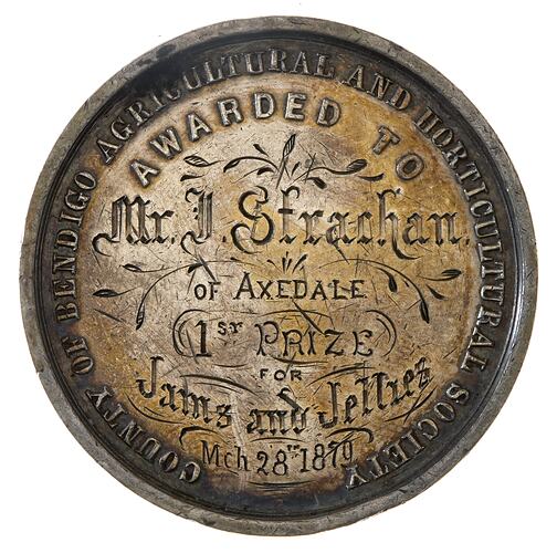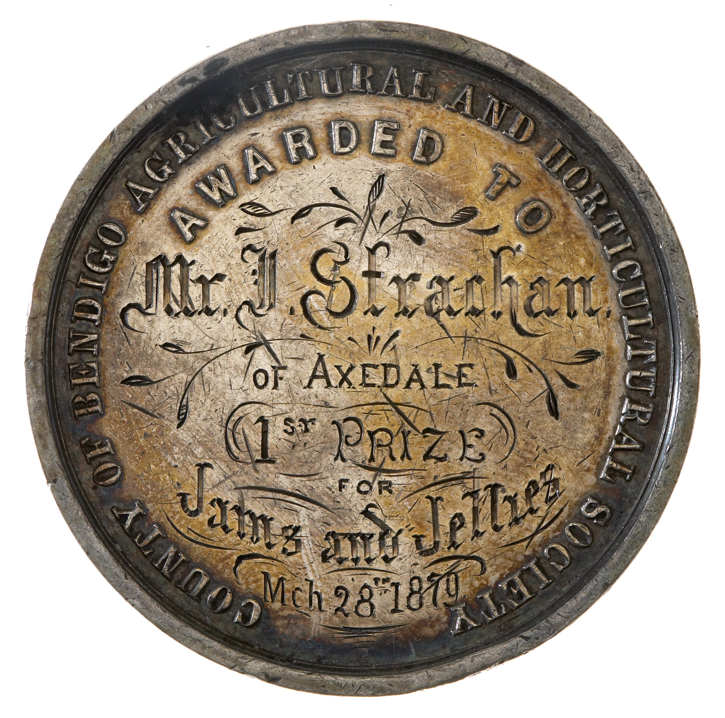Around rim, COUNTY OF BENDIGO AGRICULTURAL AND HORTICULTUAL SOCIETY at centre, AWARDED TO / Mr. T. Strachan / of AXEDALE / 1st PRIZE / for / Jams and Jellies / Mch 28th 1879