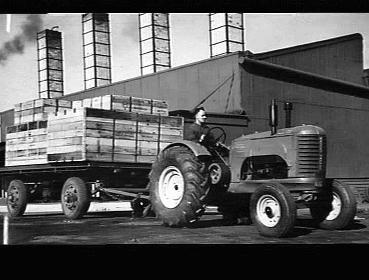 H.V. McKay employee driving a Massey Harris Model '102' tractor towing a trailer loaded with flat-packed farm implements ready for export. The building in the background is the Annealing Department.
