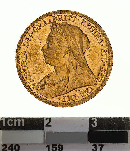 A gold coin (21.5 mm diameter with milled edge) featuring a crowned bust of Queen Victoria facing left, veiled and draped, wearing ribbon and Star of Garter; around VICTORIA . DEI . GRA . BRITT. REGINA . FID . DEF . IND . IMP . , the artist's initials, T.B. are below the bust. The reverse features St. George on horseback holding short sword in right hand, wearing a flowing cape, helmet and boots; the horse rearing to right over a fallen dragon which has a broken lance in its chest; the date, 1894 in the exergue. The mint mark S is in the ground above the middle of the date.