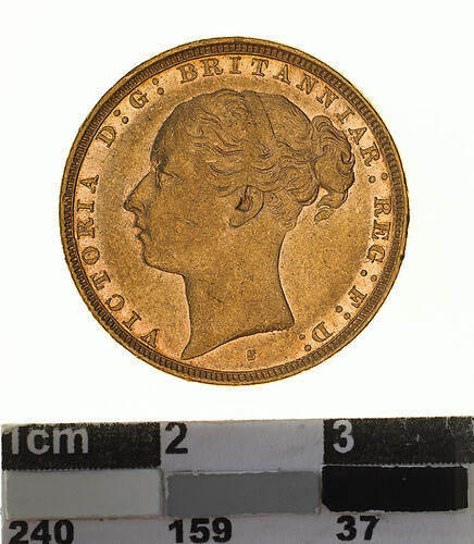 A gold coin (21.5 mm diameter with milled edge) featuring a young head of Queen Victoria facing to left, with a plain band and fillet around hair. The mint mark S below; around, VICTORIA D:G: BRITANNIAR: REG: F:D: The artist's initials W.W. on the truncation of the neck.The reverse features St. George on horseback holding short sword, the horse rearing to right over a fallen dragon which has a broken lance in its chest; in exergue, the date, 1882 and the artist's initials B.P.