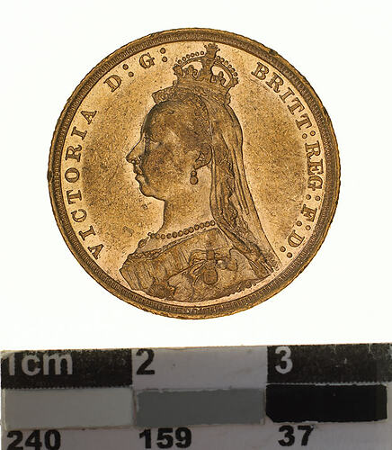 A gold coin (21.5 mm diameter with milled edge) featuring the Jubilee bust of Queen Victoria wearing imperial crown and facing left, a long veil falls behind the head, the bust is draped and decorated with the Star of the Garter, and also the badge of the Imperial Order of the Crown of India; around, VICTORIA D:G: BRITT: REG: F:D: , the artist's initials J.E.B. below the shoulder.The reverse features St. George on horseback holding a short sword in his right hand, the horse rearing to right over a fallen dragon which has a broken lance in its chest; in exergue, the date, 1891 and the artist's initials B.P.; the mint mark, S, is in the ground above the middle of the date.