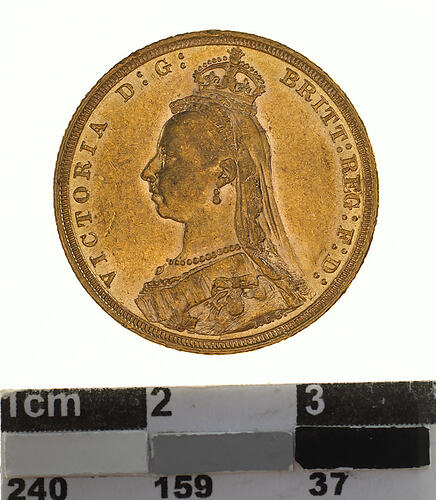 A gold coin (21.5 mm diameter with milled edge) featuring the Jubilee bust of Queen Victoria wearing imperial crown and facing left, a long veil falls behind the head, the bust is draped and decorated with the Star of the Garter, and also the badge of the Imperial Order of the Crown of India; around, VICTORIA D:G: BRITT: REG: F:D: , the artist's initials J.E.B. below the shoulder.The reverse features St. George on horseback holding a short sword in his right hand, the horse rearing to right over a fallen dragon which has a broken lance in its chest; in exergue, the date, 1889 and the artist's initials B.P.; the mint mark, S, is in the ground above the middle of the date.