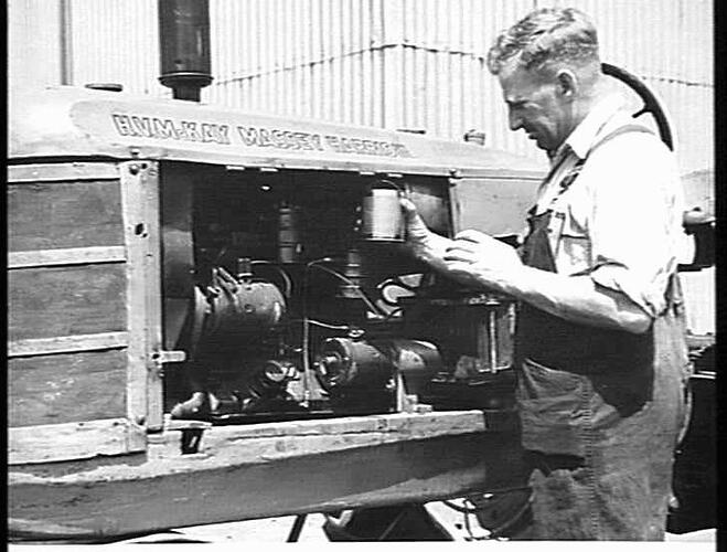 H.V. McKay employee, Mr Tommy Anderson, changes the oil filter on an old Massey Harris tractor engine, at the rear of the tractor department at the Sunshine factory.