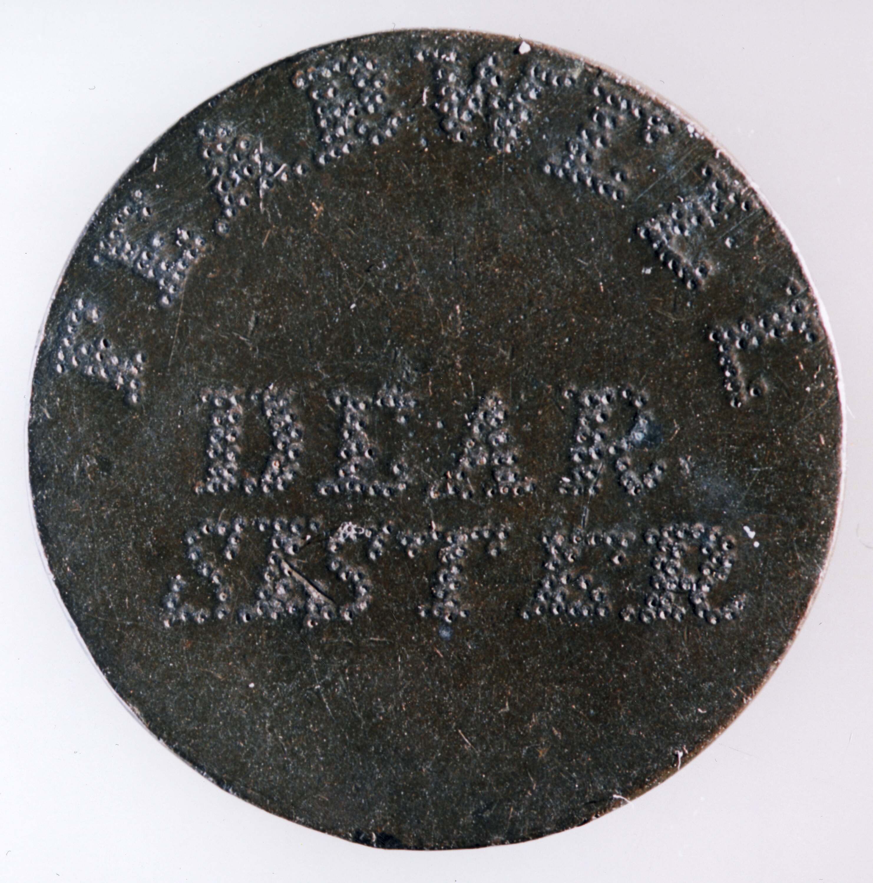 Plain (edge) Stippled, FEARWELL / DEAR / SISTER (obverse) Stippled at centre an anchor; around, WILLIAM ADAMS 1834 (reverse)
