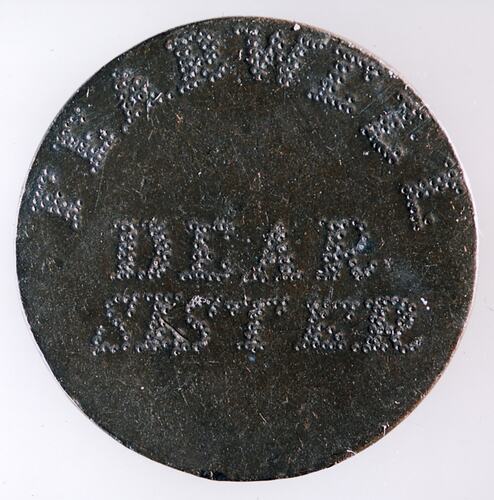 Love tokens were often commissioned by convicts before they were transported to Australia, as a memento for their loved ones. Itinerant engravers visited the prisons and hulks, finding a ready market for these tokens, which were made to order from smoothed-down coins.
