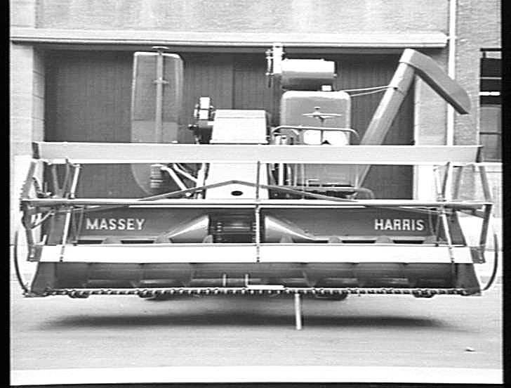 Front view of a Massey Harris (U.K.) Model 726 header, 'Austin' engine powered, showing the cutter bar, reverse action spiral, entrance to the elevator, bat reel, crop dividers, steering wheel, air-intake, conveyor to the drum, grain tank and unloading au.