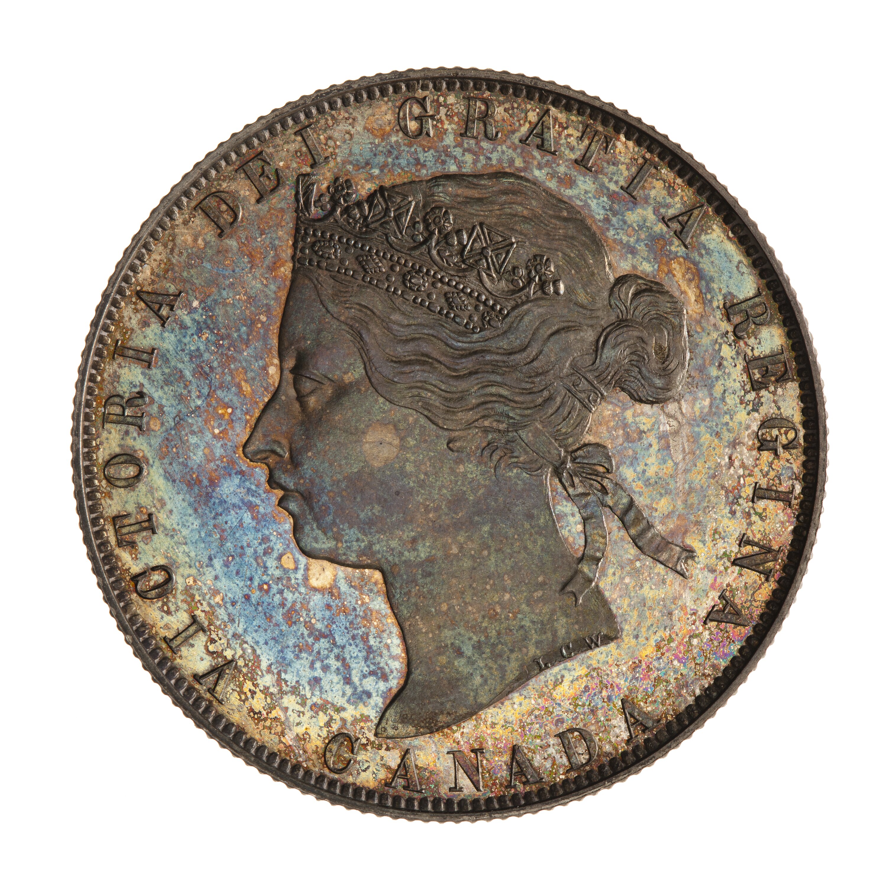 Head of the Queen facing left wearing a coronet; around, VICTORIA DEI GRATIA REGINA; below, CANADA; artist's initials, L.C.W., on neck truncation