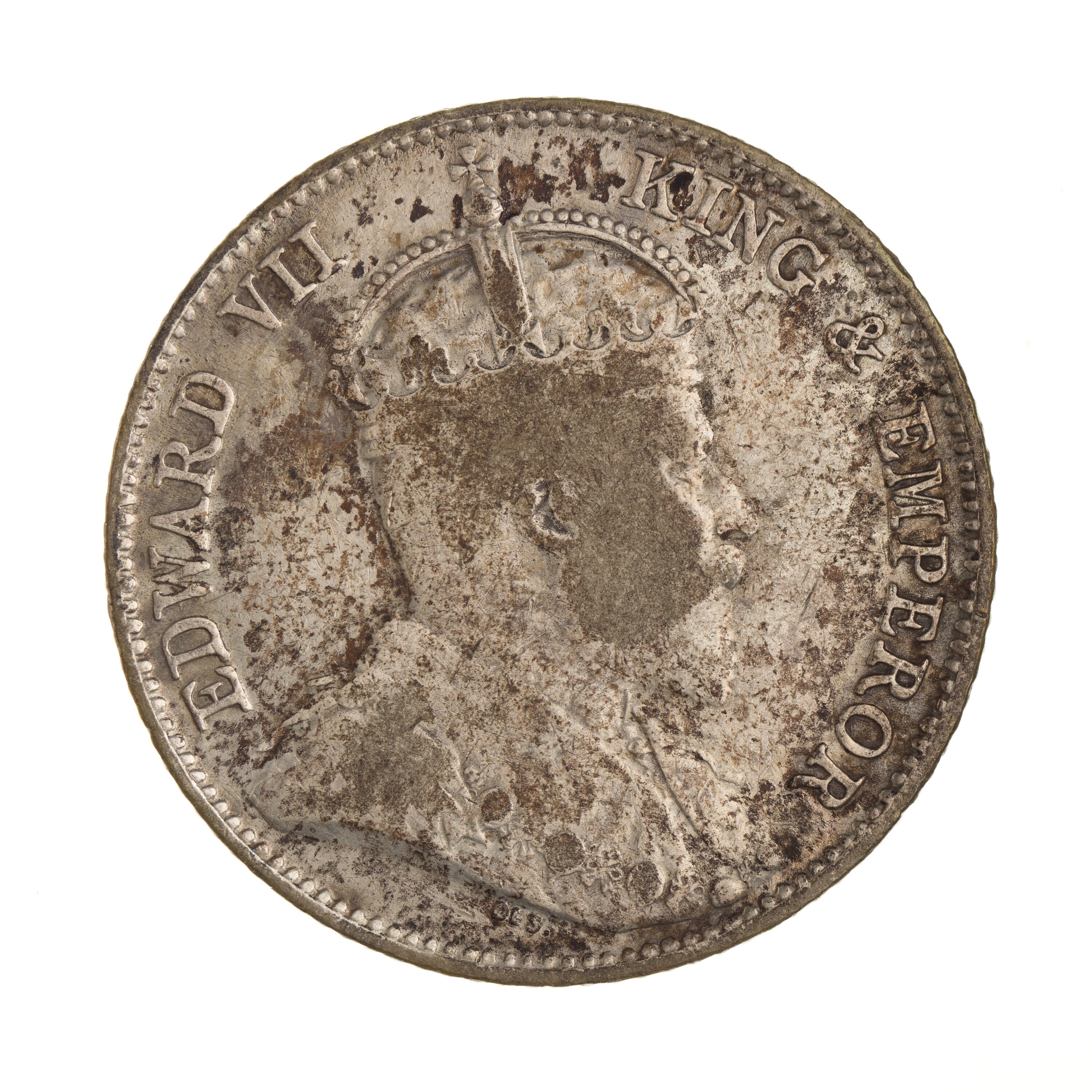Crowned bust of the King facing left wearing an ermine robe, with the collar of the Garter; around, EDWARD VII KING & EMPEROR; artist's initials, DES, below bust