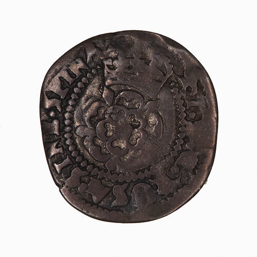 At centre within a circle of beads, a rose; above, crown; around, (mm. mullet) I D G ROSA SINE SPINA (translation, James by the Grace of God, a rose without a thorn)