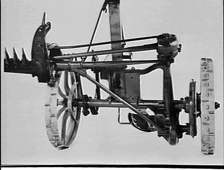 Under view of a 1.s. Oil bath mower showing the adjusting bars for grass height and angle of cut. Also shown is the inside skid shoe on the cutter bar and the inbuilt grips on the wheels for positive drive.