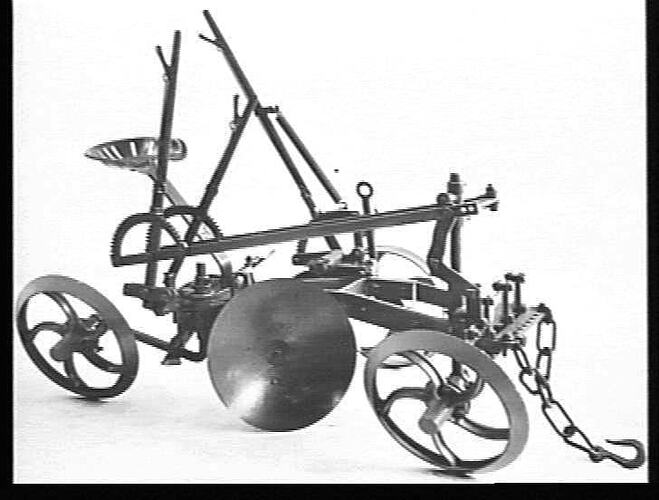 Front view of a horse drawn 'Sunnie' disc plough fitted with standard cast steel wheels. This implement was mainly used in orchards, market gardens or small farms. The disc size was 23 inch. Note the special steel hexagon spanner (shown above and to the right of the disc) for axle removal.
